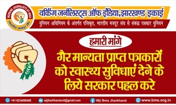 वर्किंग जर्नलिस्ट ऑफ इंडिया झारखण्ड इकाई के पत्रकार हेल्पलाइन नंबर 74 81 96 95 96 पर आपका 24 × 7 घण्टे स्वागत है संगठन राज्य के देवतुल्य पत्रकार बंधुओं के सहयोग के लिये कटिबद्ध है वर्किंग जर्नलिस्ट ऑफ इंडिया झारखंड इकाई अपने शोषित पीड़ित वंचित पत्रकार बंधुओ के सहयोग के लिये 24 × 7 घंटे तत्पर्य है। यदि आप भी है किसी संकट मे ओर आपको चाहिए मदद 74 81 96 95 96 पर बेहिचक सम्पर्क करे।